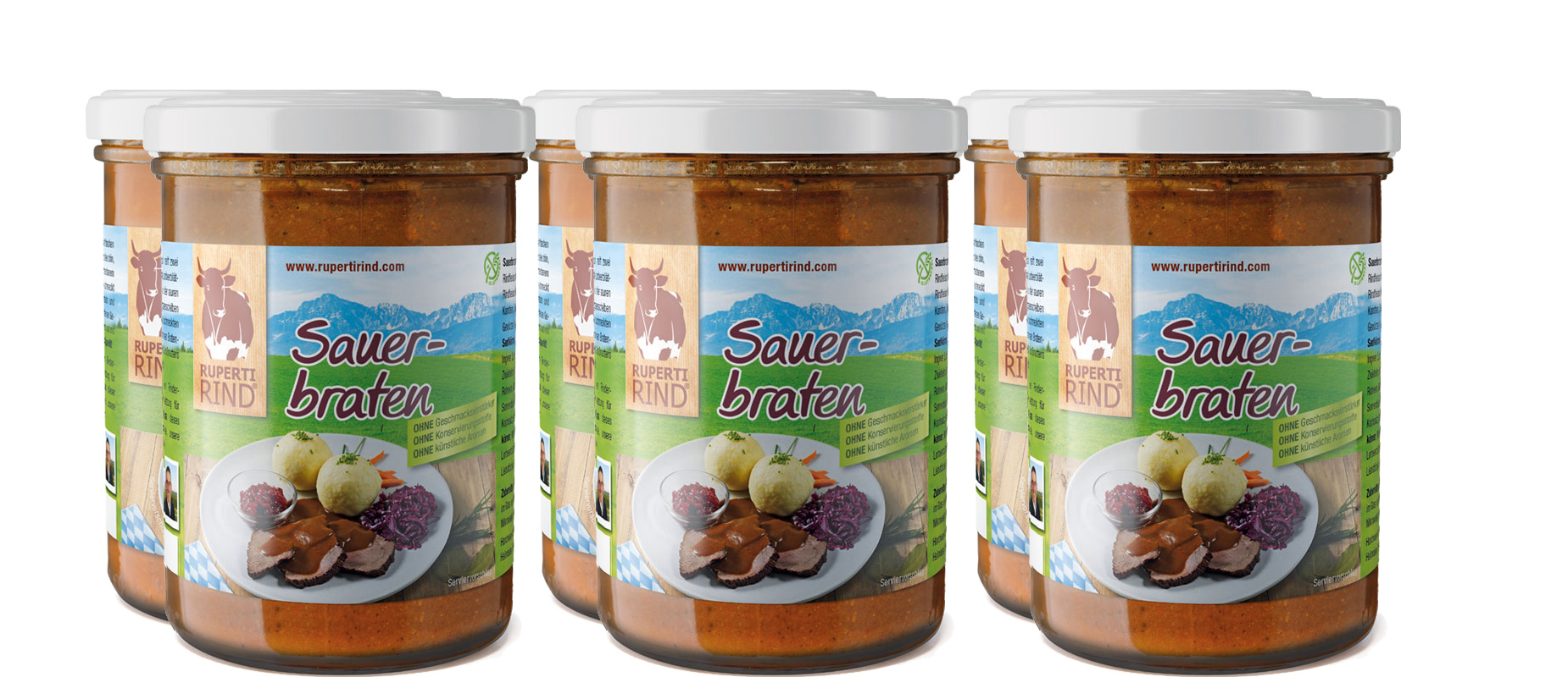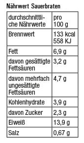 Unser selbstgemachter Sauerbraten reift zwei Wochen lang mit feinem Gemüse, Lorbeerblättern, Nelken und Wacholderbeeren in der sauren Beize. Die fett- und sehnenfreien Bratenscheiben werden von Hand mit der fein abgeschmeckten und angenehm säuerlich ausgewogenen Bratensauce eingefüllt. Der Klassiker nach Großmutters Rezept!