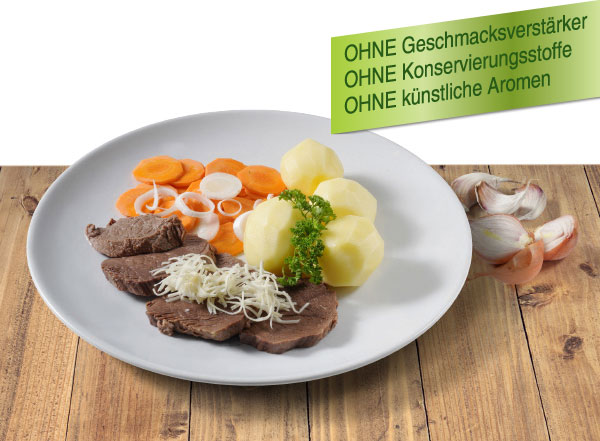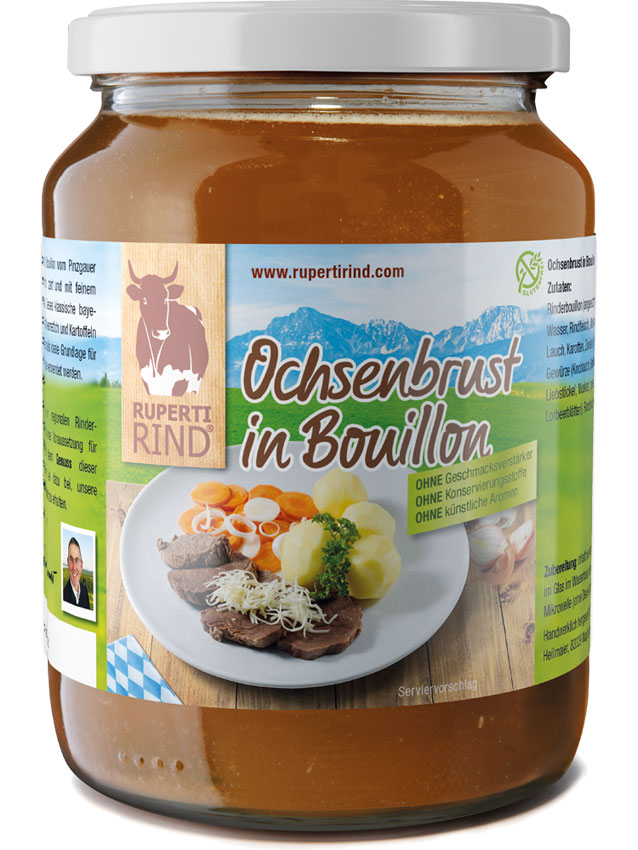 Unsere Ochsenbrust in Bouillon vom Pinzgauer Ochsen ist bekömmlich, zart und mit feinem Rindfleischgeschmack. Dieses klassische bayerische Gericht wird mit Meerrettich und Kartoffeln serviert. Kann aber auch als ideale Grundlage für alle Eintöpfe und Suppen verwendet werden!