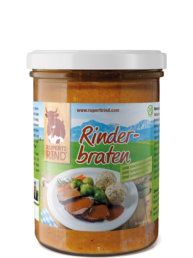 Für unseren Rinderbraten werden nur sehnenfreie Fleischstücke vom Pinzgauer Weide-Ochsen nach optimaler Reifung verwendet. Die sämige, geschmackvolle Sauce wird aus handverlesenem frischem Gemüse, angebratenen Rinderknochen, reinen Gewürzen und Kräutern hergestellt und mit Rotwein und Rosmarin verfeinert und abgeschmeckt!